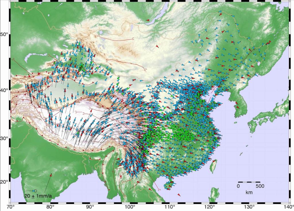 2. 利用高精度地壳运动三维变形场研究中国大陆现今地壳运动特征,反演断裂带震间滑动速率及闭锁分布运动学等,评估地震风险,并开展地球动力学变形机制研究。