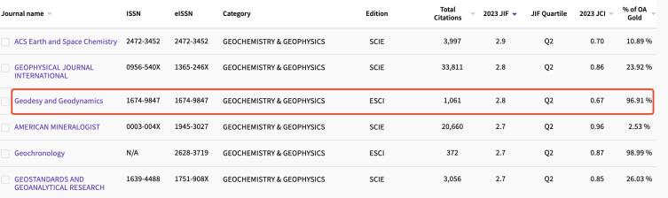 6月20日,科睿唯安正式发布了2023年度《期刊引证报告》(Journal Citation Report,简称JCR),《Geodesy and Geodynamics》影响因子(Impact Factor, IF)为2.8,在Geochemistry&Geophysics学科分类中位于Q2区,这标志着期刊国际学术影响力进一步提升。
