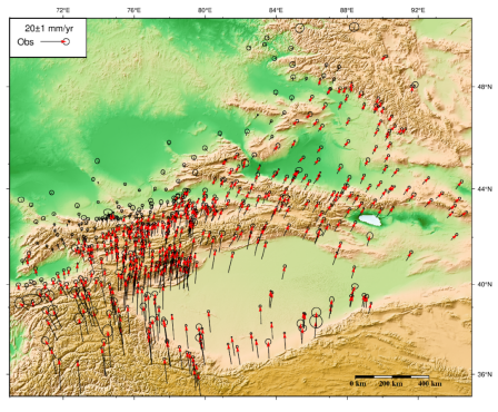 天山造山带是欧亚大陆内部最大的陆内再生造山带,全长约2500公里,呈现出东窄西宽的楔形山体结构(图1)。经历了中生代的整体隆起、剥蚀和上地幔加热之后,天山自晚新生代由于印度板块与欧亚板块碰撞的远场作用重新活跃起来。这种构造相互作用导致天山在晚中新世快速抬升,过去数百万年间地壳缩短了约200公里。除了大规模的逆冲挤压变形,这一地区的历史地震还显示了显著的走滑剪切特征。例如,1911年的柯敏M8.0级地震和1716年的特克斯M7.5级地震,这两次地震都是带有明显走滑分量的逆冲型地震,说明走滑运动在天山的构造变形中同样扮演了重要角色。那么,天山现今的变形是如何分配的?山体内部和边界的断层分别起到什么作用?针对这些问题开展地壳形变研究,不仅能帮助我们更加深入地理解天山在印度—欧亚板块碰撞的远场效应影响下的动力学过程,同时对评估区域地震风险也具有重要的参考价值。